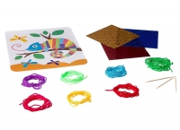 В набор входит самоклеящаяся цветная основа для картины, набор шерстяных нитей, деревянные палочки.