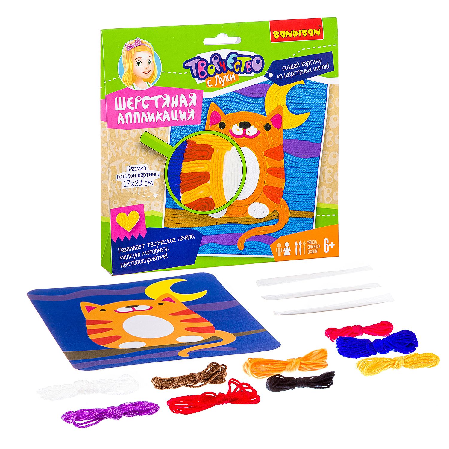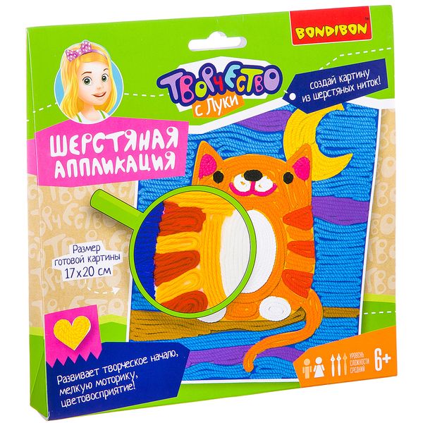 В помощь - специальные деревянные палочки. В набор входит самоклеящаяся цветная основа для картины, набор шерстяных нитей, деревянные палочки.