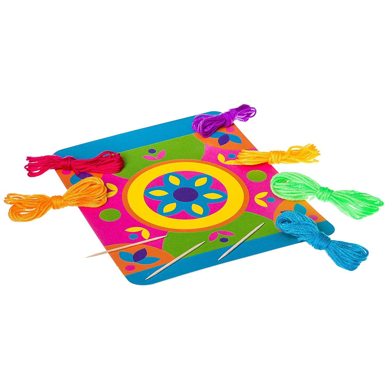В набор входит самоклеящаяся цветная основа для картины, набор шерстяных нитей, деревянные палочки.