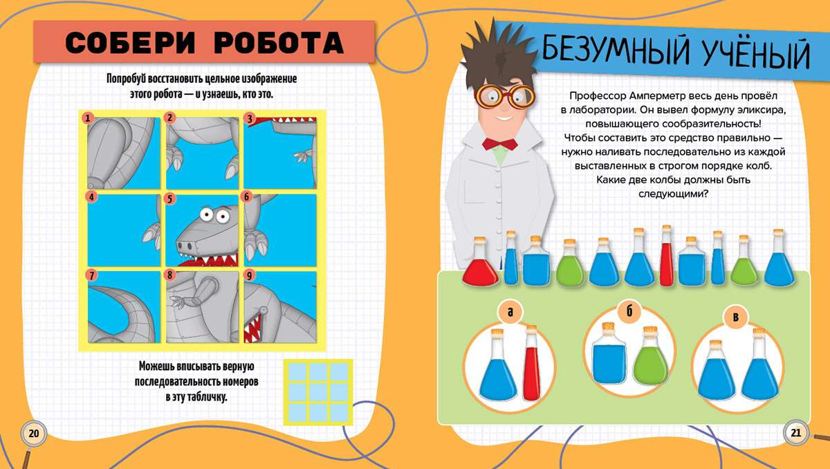 Все задания поданы с фантазией и юмором и не только разовьют у вашего маленького детектива логику, внимание и память, но и стимулируют его воображение и творческое мышление. Среди лёгких заданий обязательно встретятся серьёзные головоломки.