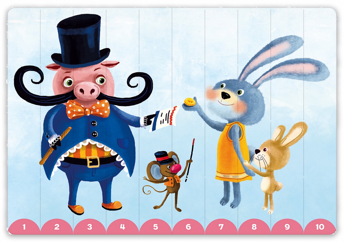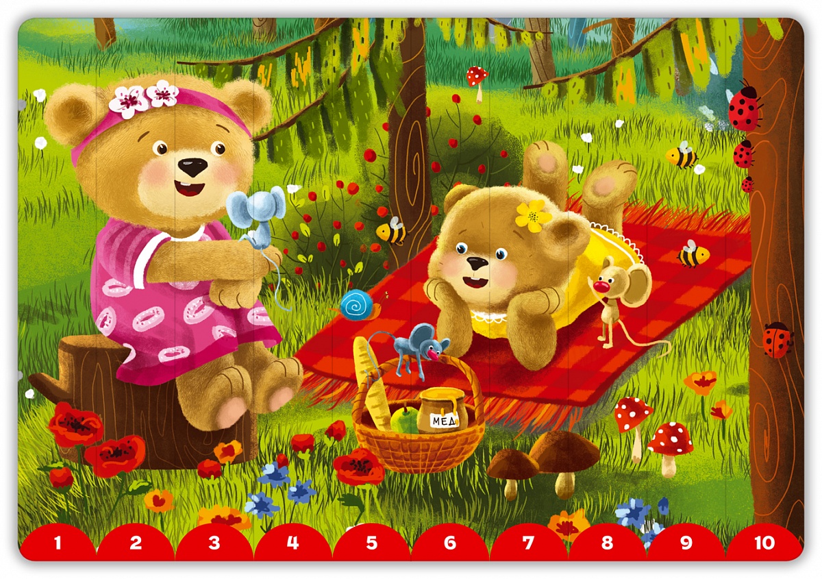 - 20 ярких и красочных картинок с изображениями забавных медвежат, разделенных на 10 пронумерованных частей-полосок, выдержанных в общей цветовой гамме. Для того чтобы получилась картинка, нужно сложить все части-полоски с цифрами по порядку – от 1 до 10.