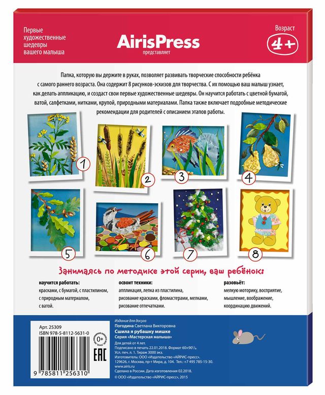 Данное пособие позволяет развивать творческие способности ребёнка с 4 лет. Оно содержит 8 рисунков-эскизов для творчества. С их помощью ваш малыш узнает, как делать аппликацию и создаст свои первые художественные шедевры. Он научится работать с цветной бумагой, ватой, салфетками, нитками, крупой, природными материалами.