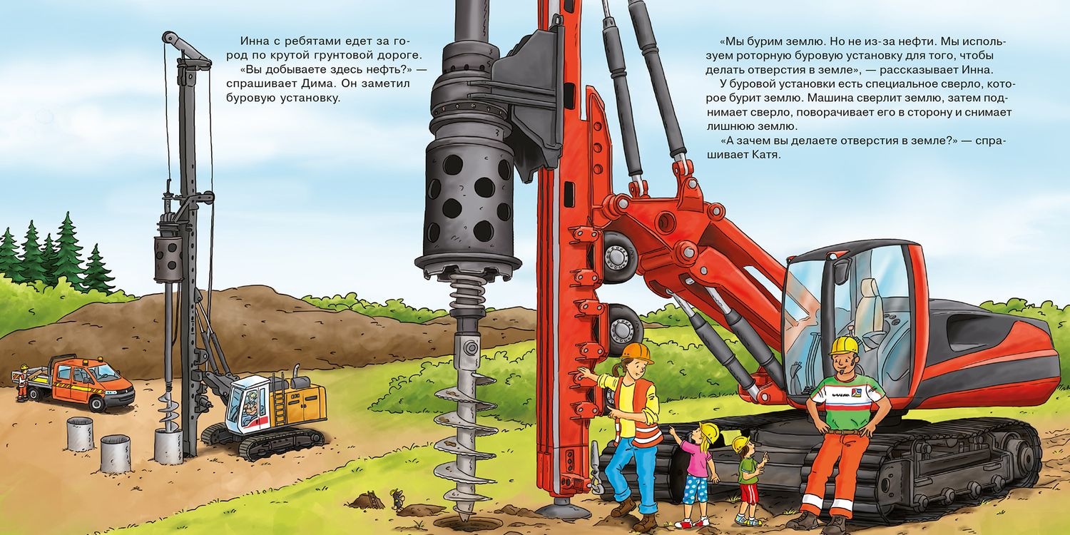 На каждом книжном развороте внимание Вашего малыша привлекут красочные тщательно прорисованные изображения специальных машин, используемых на различных этапах, связанных со строительством автодорог. Это гусеничный экскаватор с огромным ковшом и мощный самосвал, выравниваюший дорожное покрытие бульдозер и уплотняющий слой щебня грейдер, асфальтоукладчик и дорожный каток, бетономешалка и подъёмный кран.