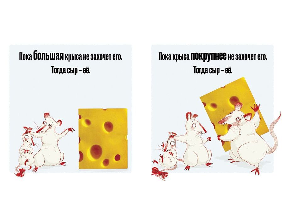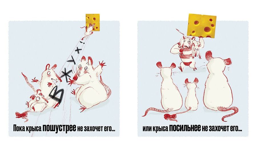 Закон крыс краток и прост: сыр твой. А значит, если большая крыса захочет его - сыр её. Если, конечно, сильная крыса не захочет его - тогда сыр её. Но только до тех пор, пока страшная крыса не захочет его; если страшная крыса захочет сыр - он её. Будь вы большая крыса или сильная, шустрая или страшная, мохнатая или грязная - или даже всё разом - закон для всех один, и каждая крыса знает его. Но кому же тогда достанется сыр, кому повезёт съесть его?