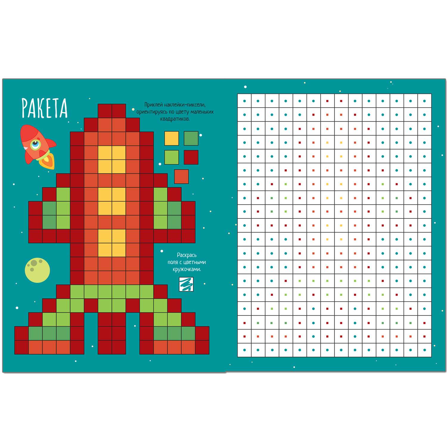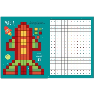 В ней необычные иллюстрации – изображения ракеты, самолета и других видов транспорта составлены из небольших разноцветных квадратиков – пикселей. Задача ребенка – повторить картинку с помощью ярких многоразовых наклеек, а затем раскрасить фон фломастерами.