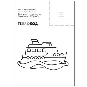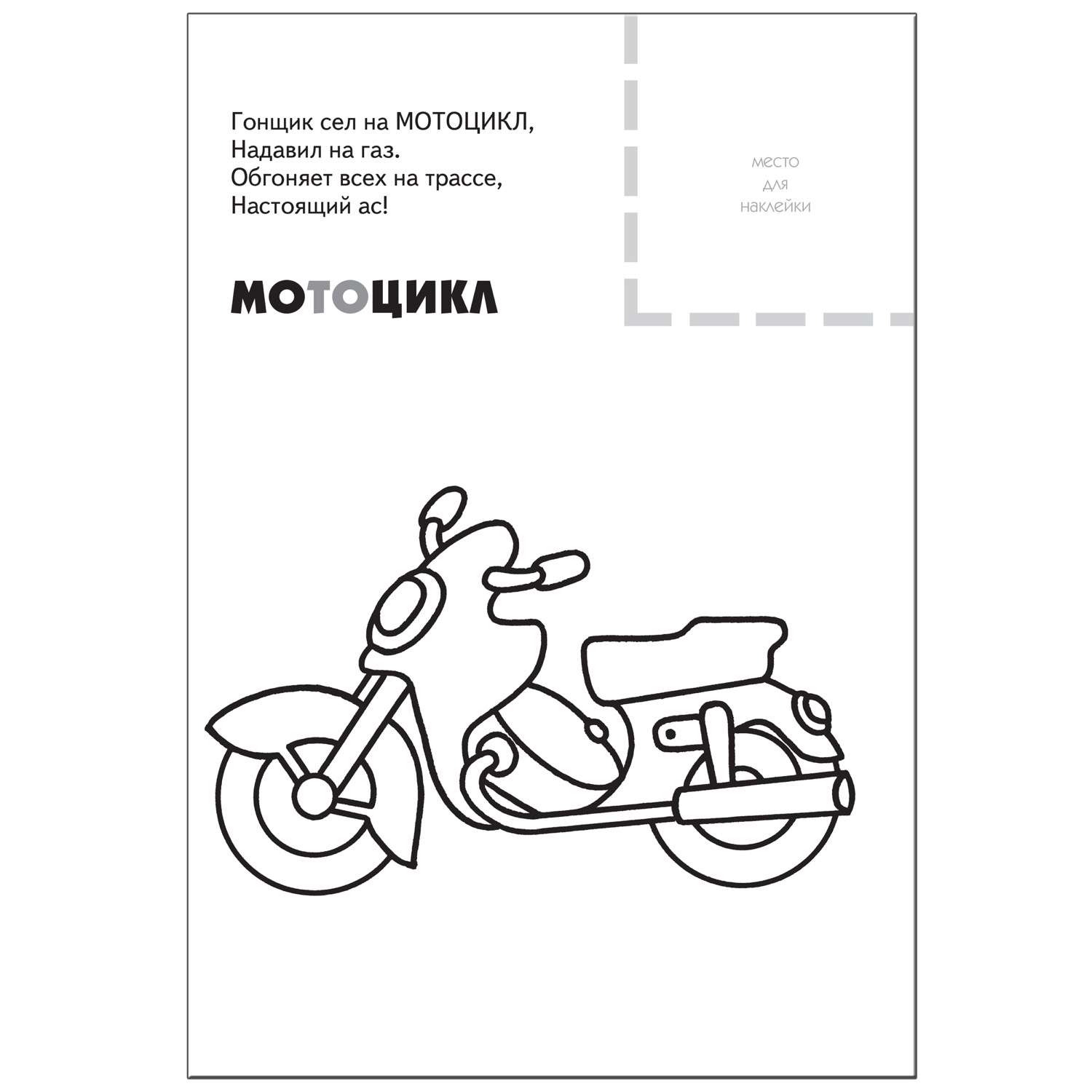 Сверху - небольшое четверостишие о персонаже, рядом - место для наклейки, а под стихотворением - непосредственно раскраска.