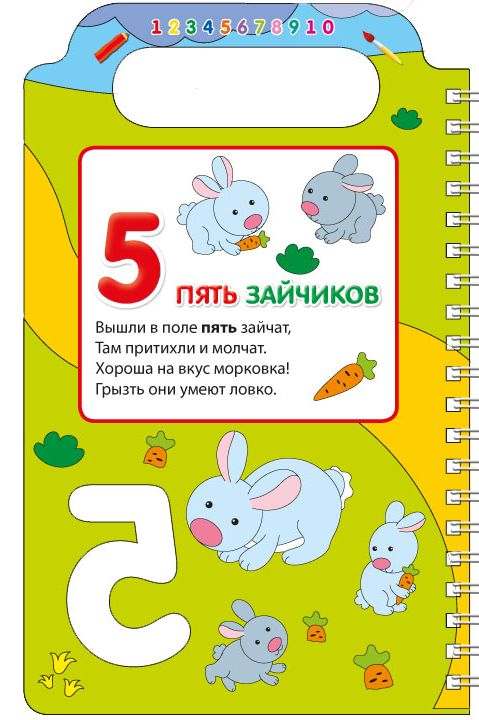 - Множество трафаретов с цифрами, веселые стихи для запоминания, а также красочные картинки с подписями.