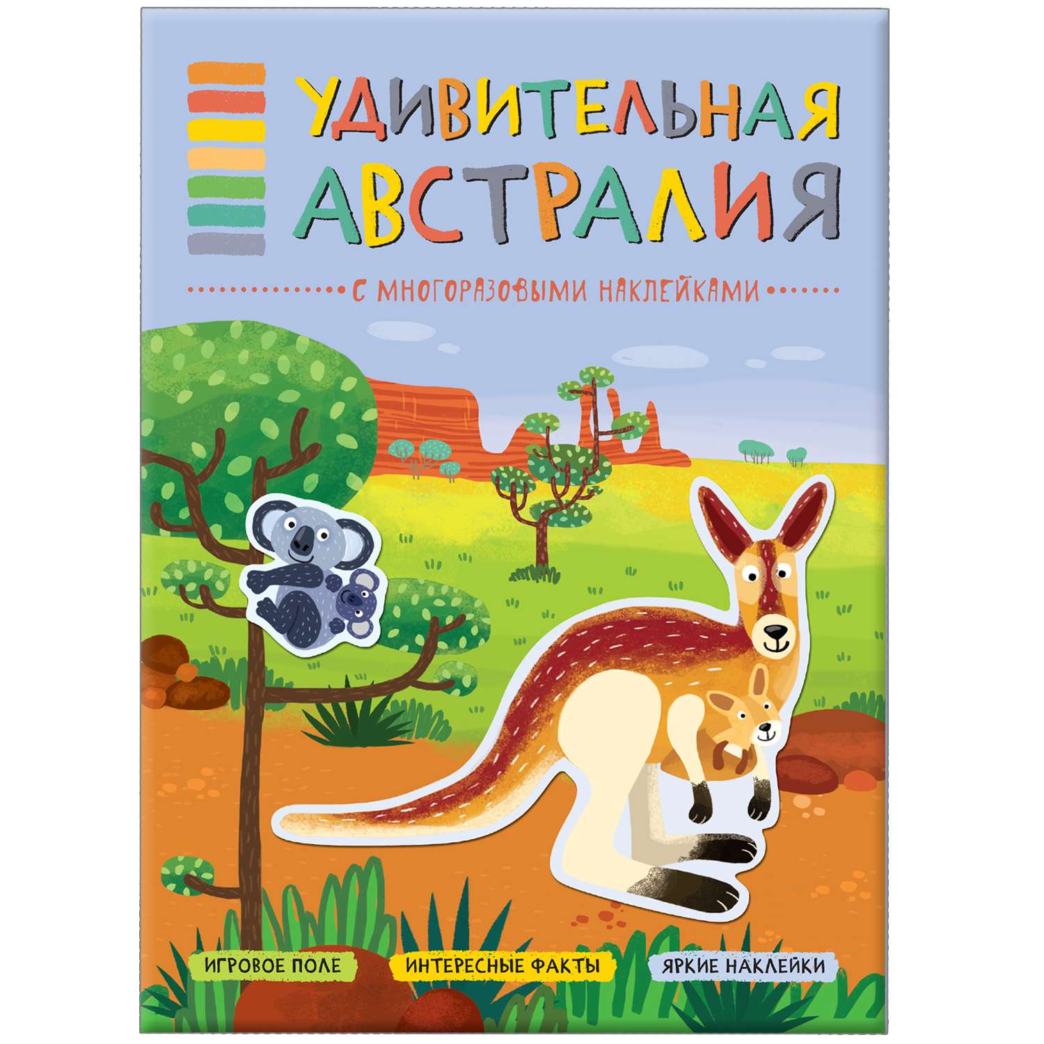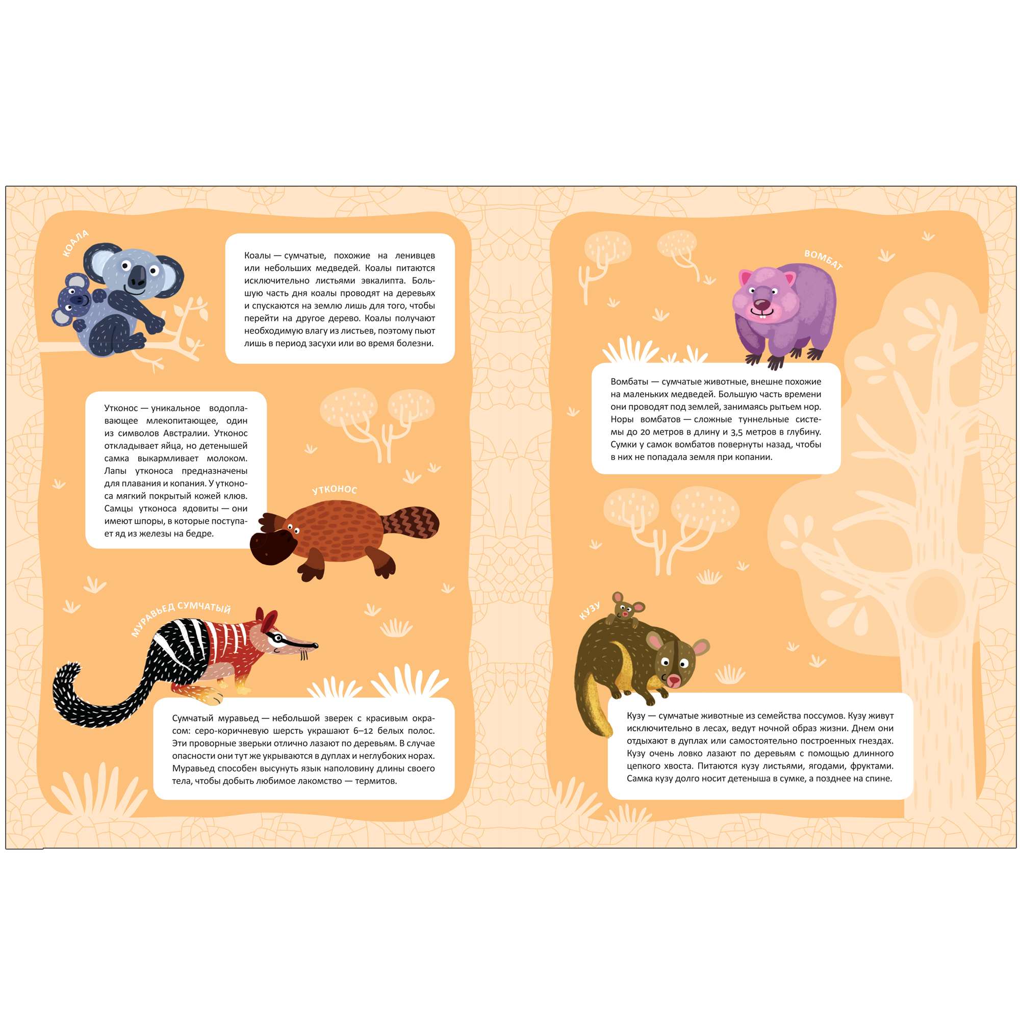 Помимо множества занимательных фактов внутри книги малыша ждет сюрприз – большая панорамная иллюстрация с изображением австралийского пейзажа. Дополняя ее яркими многоразовыми наклейками – животными Австралии, он не только закрепит новые знания, но и создаст красочный плакат, которым можно украсить стены комнаты.