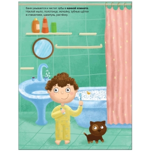 Приклеивая яркие наклейки в нужное место, ваш малыш побывает в доме – в кухне, прихожей, ванной и других комнатах, познакомится с такими понятиями как посуда, одежда, обувь и мебель.