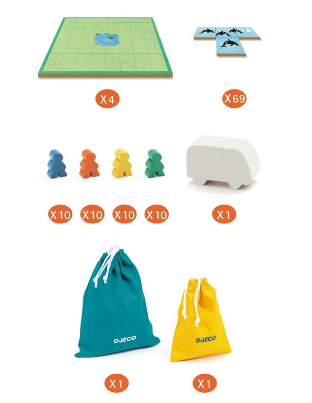 В комплекте: 4 двухсторонних шаблона (на лицевой стороне простой вариант, на оборотной – сложный). 4 карточки «вход», 45 карточек «загон», 20 карточек «дорожка», 40 фишек «посетитель» разных цветов, 1 фишка «автобус»; 1 мешочек для 65 карточек («загон» и «дорожка»); 1 мешочек для фишек «посетитель».