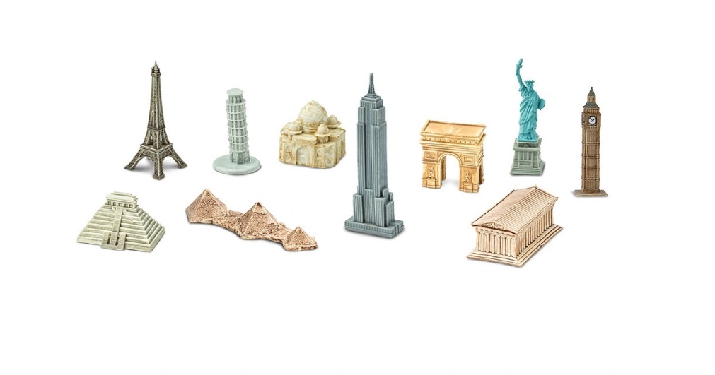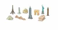 Набор в тубе из 10 фигурок мировых достопримичательностей: Э́йфелева ба́шня, Пизанская башня, Тадж-Махал, Триумфальная арка, статуя Свободы, Биг-Бен, Храм надписей, пирамиды Гизы, Эмпайр-стейт-билдинг, Парфенон. Размер фигурок варьируется от 3 до 10 см. Фигурки окрашены вручную.