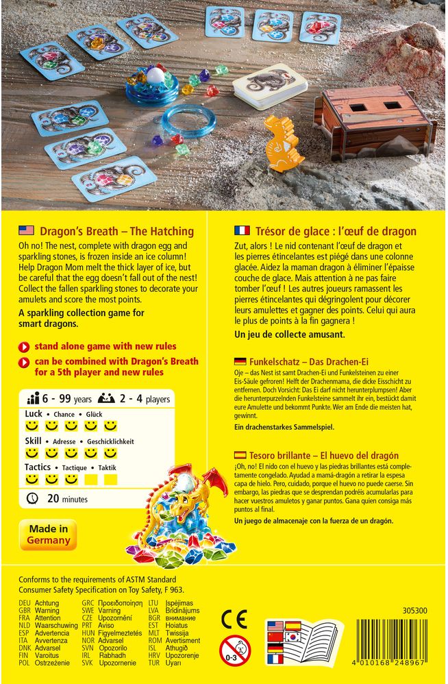 Комплектация: 3 ледяных кольца, 35 сверкающих камней (по 7 в 5 цветах), 1 яйцо дракона, 1 карточка гнезда, 1 мама дракона, 1 сундук с сокровищами, 48 карт амулетов, 1 комплект инструкций на английском, немецком, испанском, французском, итальянском и голландском языках.
