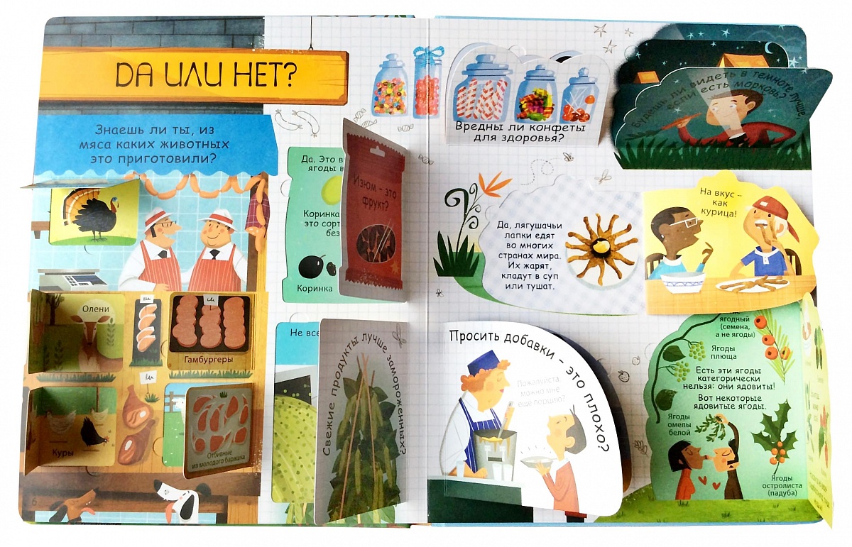 - Яркие и детальные иллюстрации, а также более 60 створок, за которыми скрываются ответы на вопросы о еде.