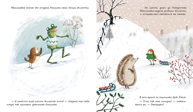 Маленькая Малиновка рада приближению Рождества. Она приготовила себе семь прекрасных тёплых жилеток для праздничной недели! Но разве можно остаться в стороне, когда твои друзья замерзают? Добрая малиновка не раздумывая отдаёт одну жилетку за другой. Неужели в канун праздника она останется без жилетки?..