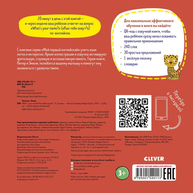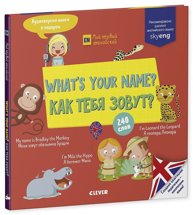 Книга What’s your name? относится к серии «Мой первый английский»: она создана опытными педагогами, носителями языка, для веселого обучения самых маленьких. Внутри вы найдете 240 слов, 30 простых предложений, одну веселую песенку и очень полезный словарик. Всего 20 минут в день — и уже через неделю малыш сможет запросто ответить на вопрос «What’s your name?» («Как тебя зовут?») по-английски.
