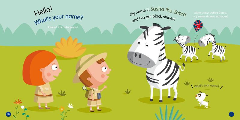 Изучение языка будет сплошным удовольствием, потому что малыш отправится в путешествие с веселыми героями, Питером и Эмили. Они окажутся в Африке и познакомятся со всеми ее обитателями, что встретятся на их пути: зеброй и обезьяной, леопардом и слоном, крокодилом и даже питоном. Они узнают и их имена, и их особенности. Яркие иллюстрации и озвучка активируют зрительную, слуховую и ассоциативную память, а для ребенка это дополнительный стимул брать книгу What’s your name? в руки снова и снова.
