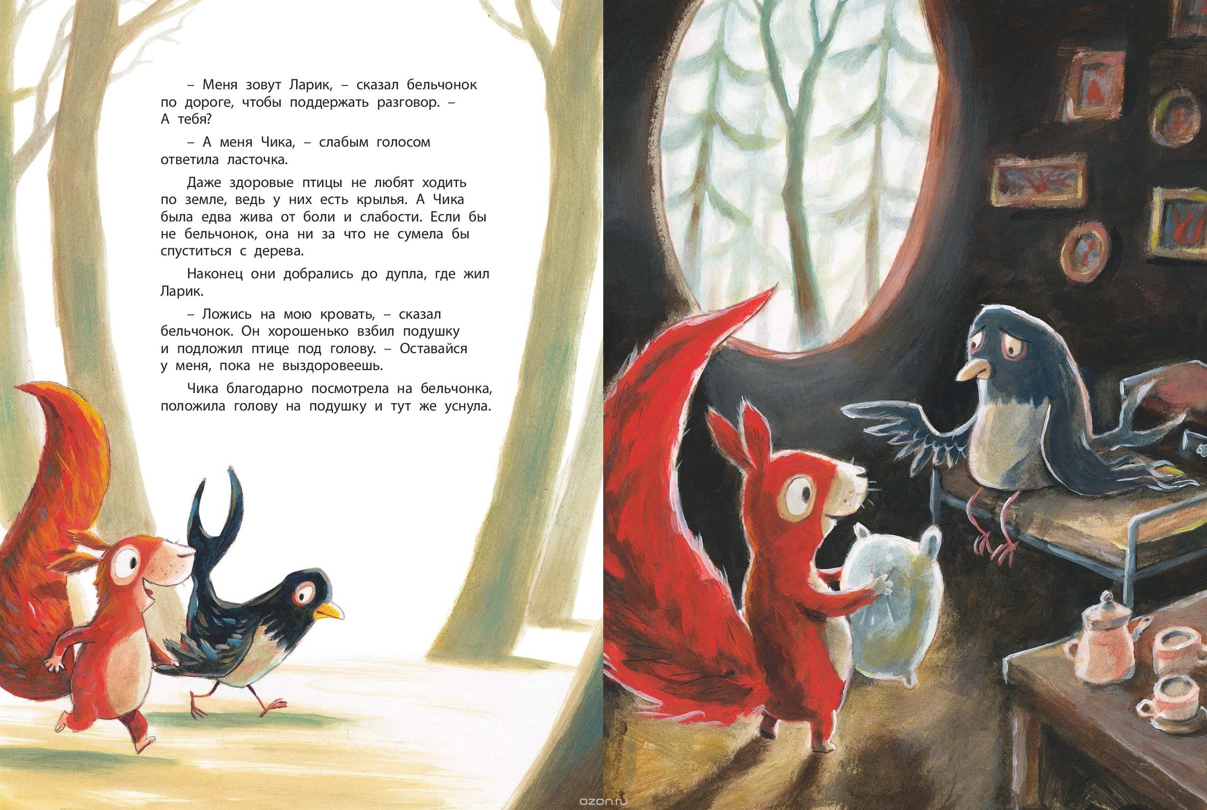 Однажды осенью ласточка сломала крыло и не смогла улететь на юг. Хорошо, что бельчонок нашел её в лесу. Вместе они скоротали зиму и подружились. Трогательную историю о том, как бельчонок спас ласточку, сочинил и нарисовал известный немецкий иллюстратор Гюнтер Якобс.