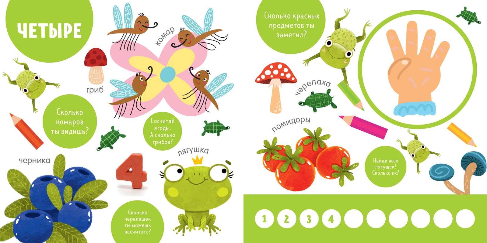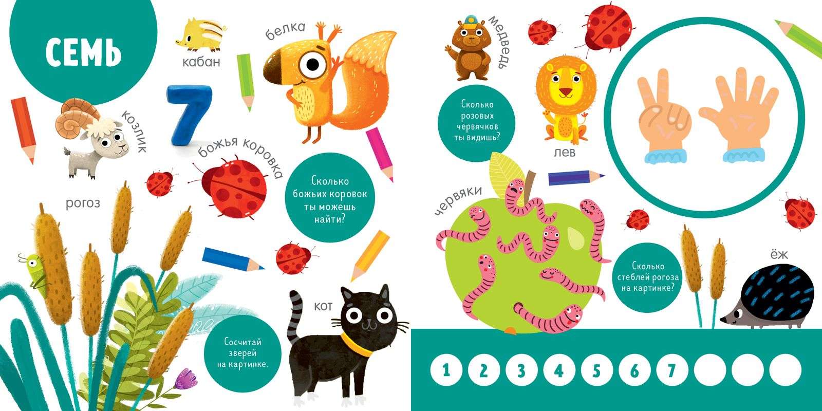 Эта книжка не только развлекательная, но и развивающая. Пока ребенок рассматривает картинки и ищет предметы, он знакомится с разными цветами и узнает названия основных фигур. Причем формат книги «Я ищу числа» подразумевает, что играть и учиться малыш может без помощи родителей, как и во всех книгах серии «Детский сад на ковре».