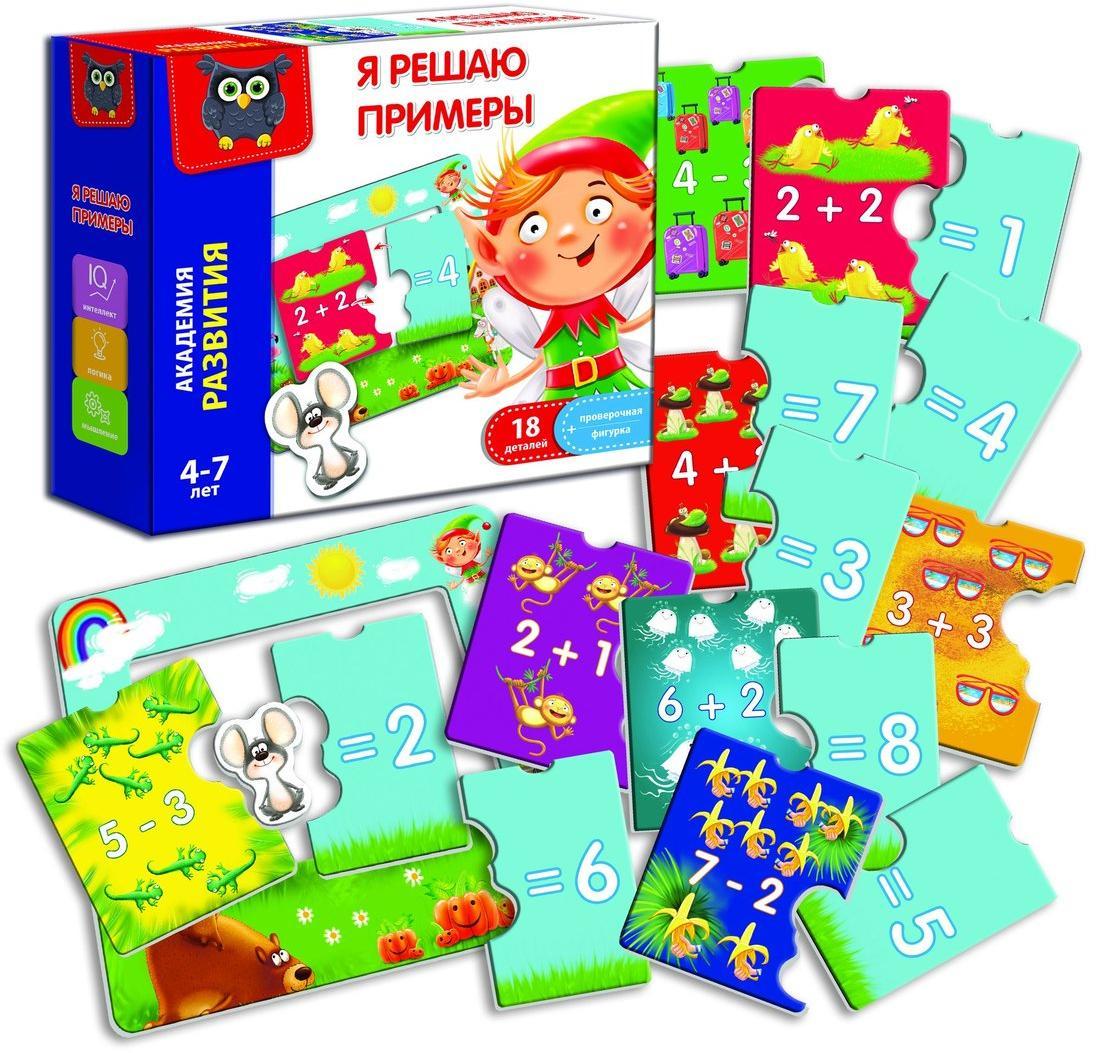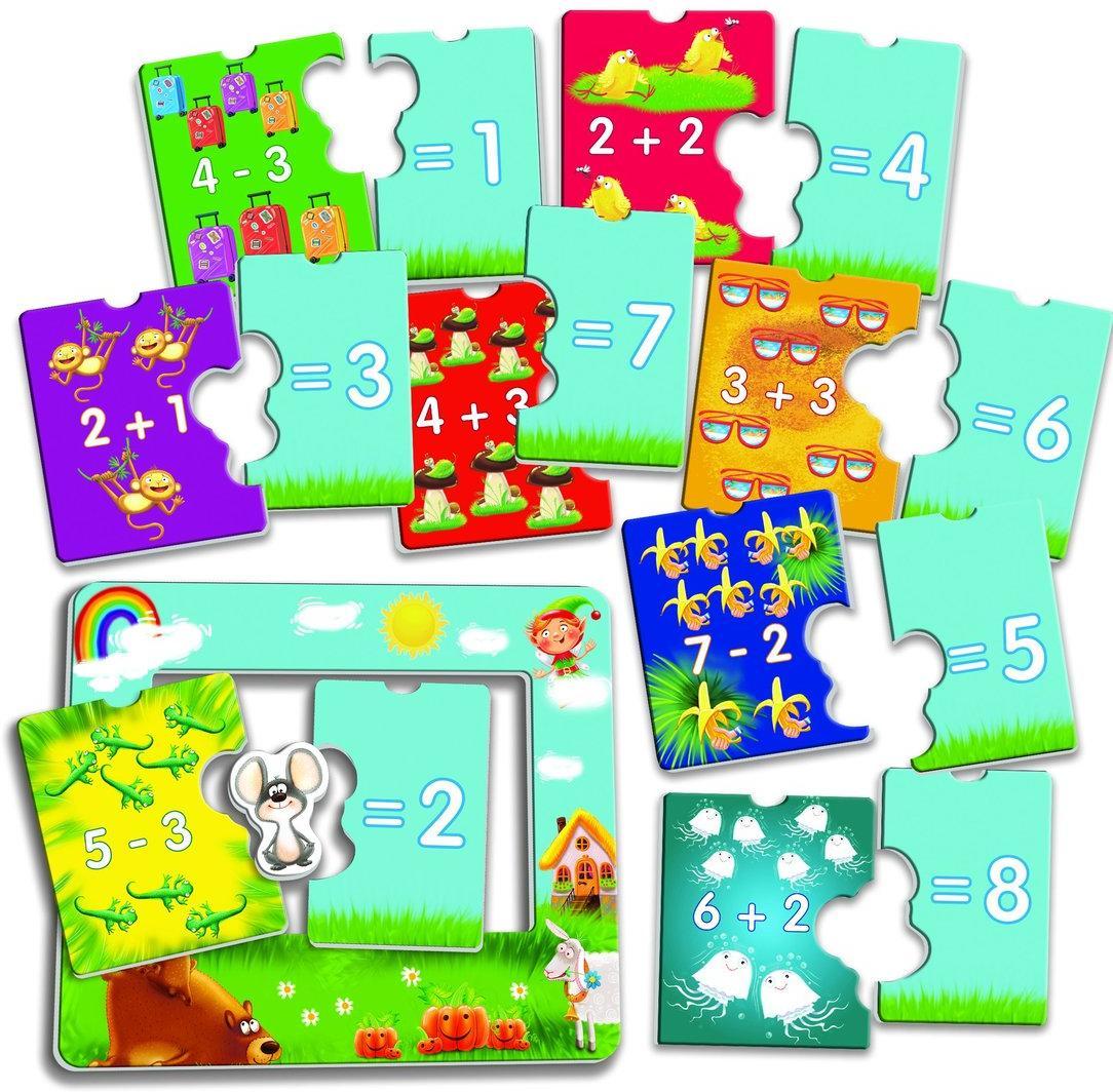 Учимся считать вместе с пазлами-парочками. Разложите все детали перед ребенком. С одной стороны положите картинки, а с другой цифры. Пусть малыш внимательно их рассмотрит, а затем подберет пару к каждому рисунку. Для этого нужно решить примеры на каждой картинке. Когда изображение будет составлено, проверьте его с помощью специальной фигурки в форме мышонка. Для удобства ребенка пазловые элементы необходимо вставить в игровое поле в форме рамки.