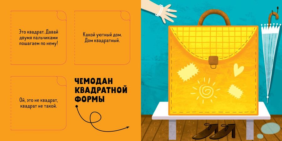 Малыш открывает окошки, за которыми нарисованы различные предметы, а мама помогает отыскать их в комнате или на улице. Какие предметы квадратные? Дом, чемодан, конфета... Стоп! Конфета овальная! Она похожа на вытянутый круг!