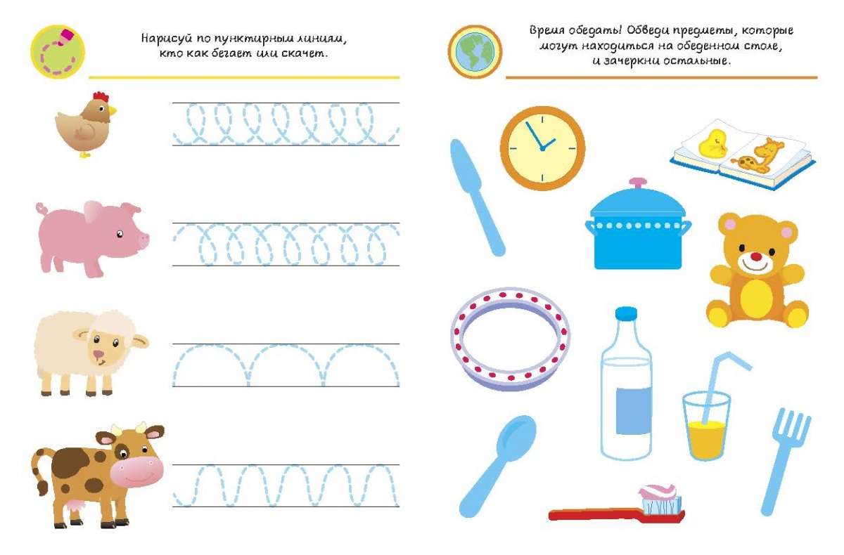 Элементы чистописания, упражнения на обведение линий и рисунок по образцу, раскрашивание собраны в рубриках «Рисуем простые линии», «Изучаем формы», «Учим буквы».