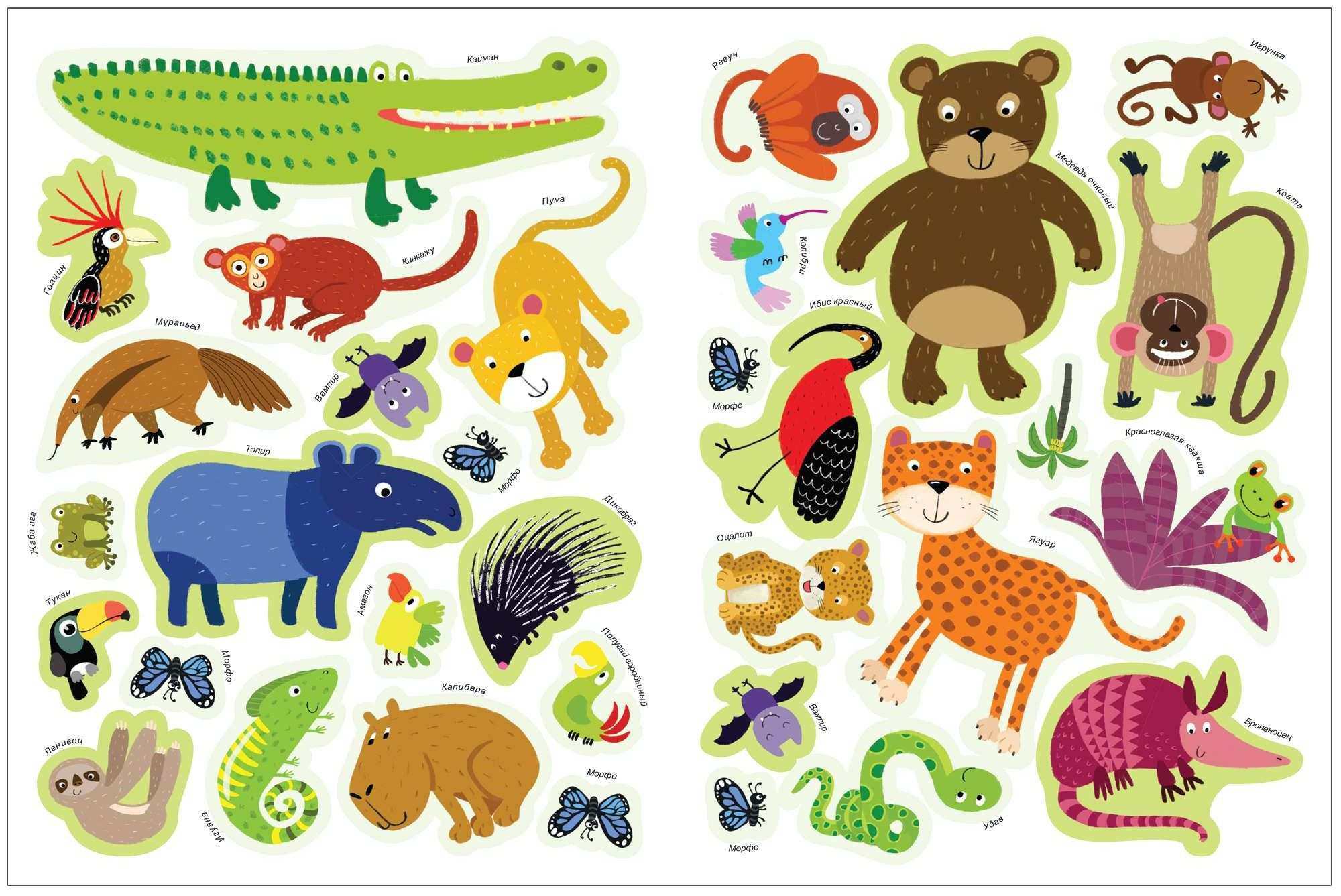 Помимо множества занимательных фактов внутри книги малыша ждет сюрприз – большая панорамная иллюстрация с изображением тропического леса. Дополняя ее яркими многоразовыми наклейками – животными джунглей, он не только закрепит новые знания, но и создаст красочный плакат, которым можно украсить стены комнаты.