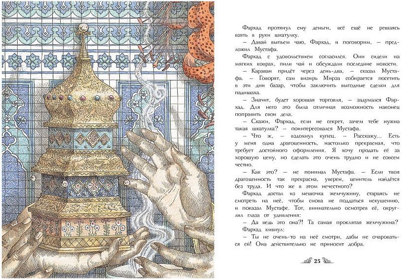 Покупка прекраснейшей в мире жемчужины обернулась для купца и его семьи настоящей бедой. Кто мог подумать, что сокровище проклято! Удастся ли купцу противостоять чарам жемчужины? Какое чудо снимет с неё проклятье? Вы всё узнаете, прочитав эту увлекательную и поучительную сказку, особое очарование которой придают изящные иллюстрации знаменитой английской художницы Ивонны Гилберт. Для младшего школьного возраста.