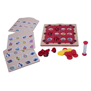 За время, отведенное песочными часами, запомните расположение картинок на игровом поле. По истечении времени закройте картинки крышечками. Попробуйте вспомнить расположение одинаковых картинок. Начиная с самого молодого участника, по очереди откройте две крышечки. Если пара нашлась, игрок получают одну фишку. В случае если найти пару не удалось, крышечки необходимо поставить на место и отдать свою фишку другому участнику. Побеждает игрок, собравший наибольшее количество фишек.