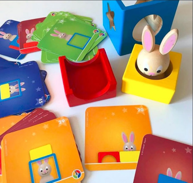 Используя фигурку кролика и три деревянных блока, собирайте конструкции, показанные на карточках с заданиями.