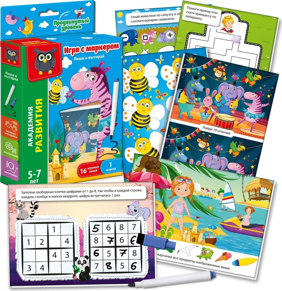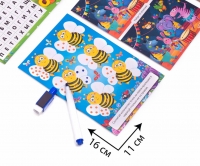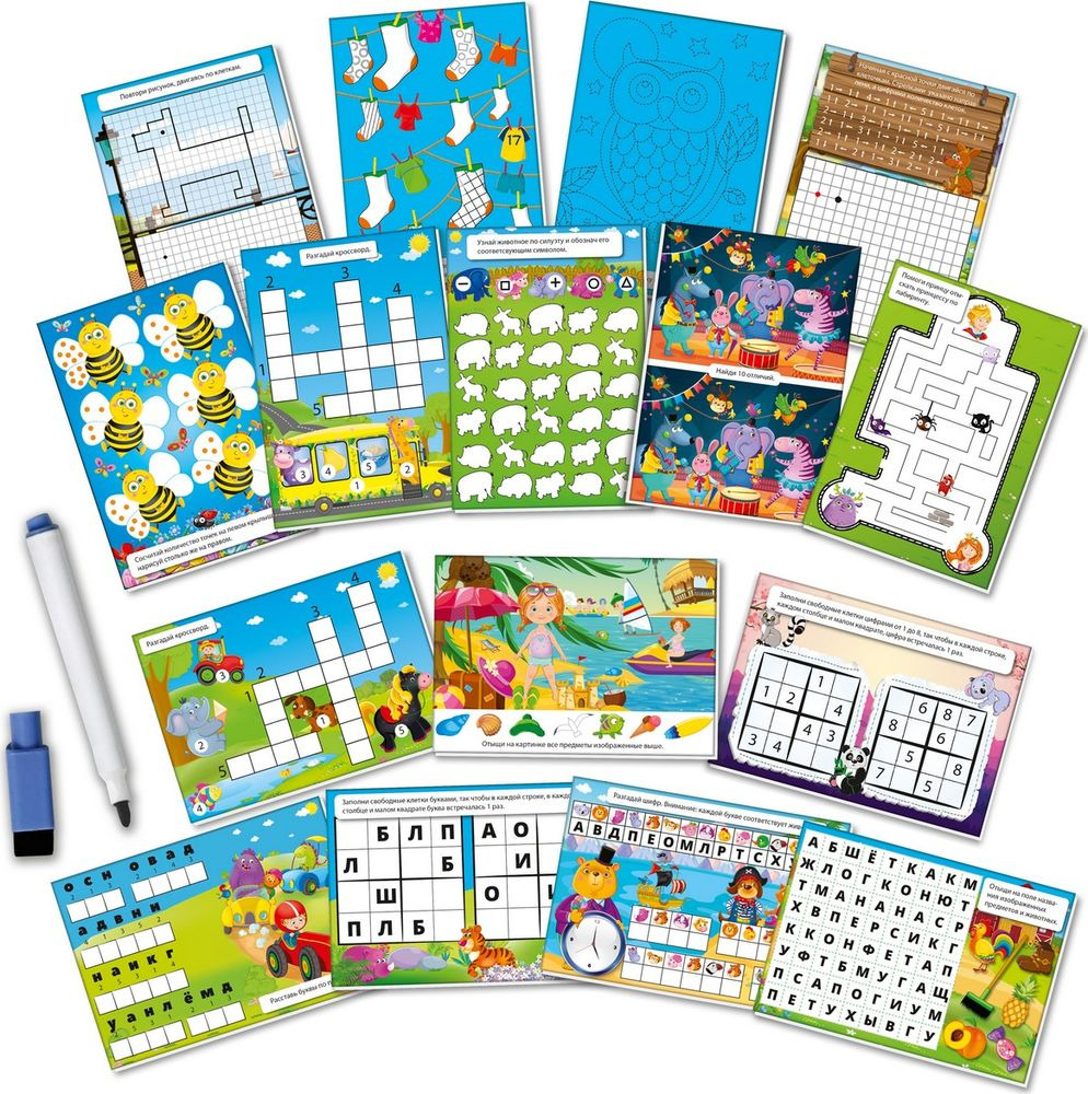 Игра с маркером из серии «Пиши и вытирай» поможет Вашему ребенку пополнить свои знания, выполняя интересные задания с карточек. Ребенок будет составлять слова и букв, решать кроссворды, проходить лабиринты, рисовать по клеточкам, находить отличия в картинках, считать и раскрашивать.