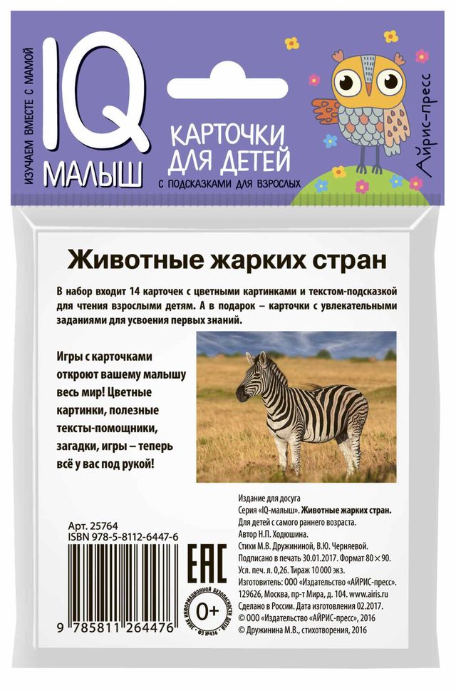 Игры с карточками знакомят малыша с нашим удивительным миром, развивают память, зрительное и слуховое восприятие, расширяют словарный запас, формируют интеллект. С помощью этого набора двусторонних карточек ребёнок познакомится с животными жарких стран. В комплект входит 14 карточек с цветными картинками и текстом-подсказкой для чтения взрослыми детям на обороте, 3 дополнительные карточки с заданиями для усвоения первых знаний и карточка с инструкцией для родителей. Для детей с самого раннего возраста.