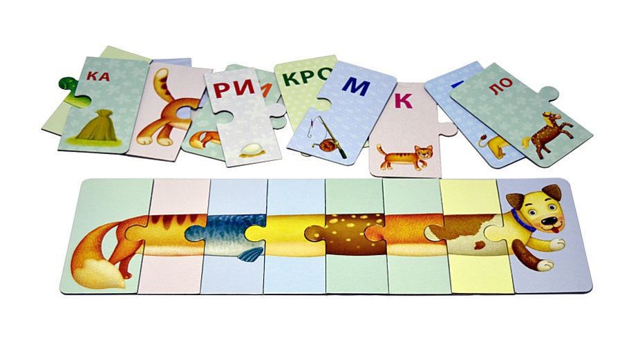 Увлекательная развивающая игра для детей, направленная на развитие мышления, внимания, зрительного восприятия, мелкой моторики и воображения! В наборе 33 карточки-пазла, из которых ребёнок сможет складывать картинки животных и слова, состоящие из трёх букв или трёх слогов. В игре используется и лицевая, и оборотная сторона карточек. Проверить правильность собранного слова можно перевернув их. Если слово собрано верно, то с другой стороны будет правильно собранная картинка. На оборотной стороне картинки вы соберёте три изображения ассоциативно связанных друг с другом. Все карточки-пазлы идеально стыкуются друг с другом, поэтому из них можно составлять смешных несуществующих зверей! Набор карточек идеально подходит как для индивидуальной игры, так и для использования в детских дошкольных учреждениях.