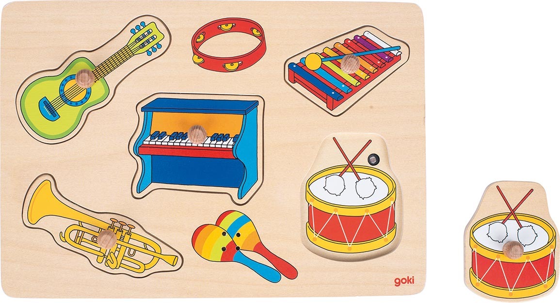 Немецкий бренд Goki не перестает удивлять! Обратите внимание на инновационное и занимательное изобретение — деревянный звуковой пазл «Музыкальные инструменты». Он включает пять съемных элементов, изображающих барабан, гитару, трубу и т.д. Пазл представляет собой деревянную дощечку с вырезанными углублениями в форме данных вкладышей. Но самой интересной особенностью игрушки являются звуковые эффекты. При выборе того или иного инструмента ребенок услышит характерный звук. В общей основе под каждой фигуркой есть датчик, реагирующий на извлечение пазла. Механизм работает от батареек.